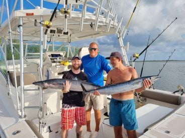 Your day begins aboard a very clean 34' Venture center console that can carry up to 6 passengers. It has outriggers, downriggers, and all the essentials no fishing machine can run without. There's a toilet on board for your convenience. Rods, reels, and tackle are provided, as well as lures. Live bait is available, but it's good to ask about this so you know if you'll be catching it yourself.