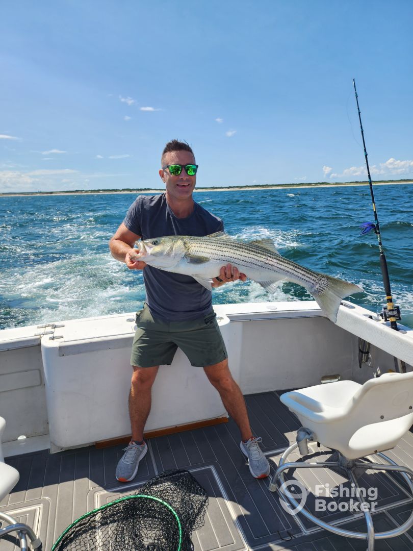 We caught 15 Stripers and a Sea Robin in 4 hours on Cape Cod bay with Captain John and First Mate Quinn. The weather held off